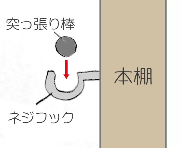 - 本棚の上部、または覆いたい高さにネジフックを取り付けます。Cの開いている部分が上になるようにしてください。