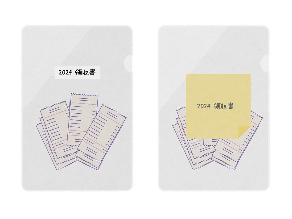クリアファイルに「病院」「仕事」「2025年」「領収書」など書いて貼る、またはそのように書いた紙を外から見えるように入れておく