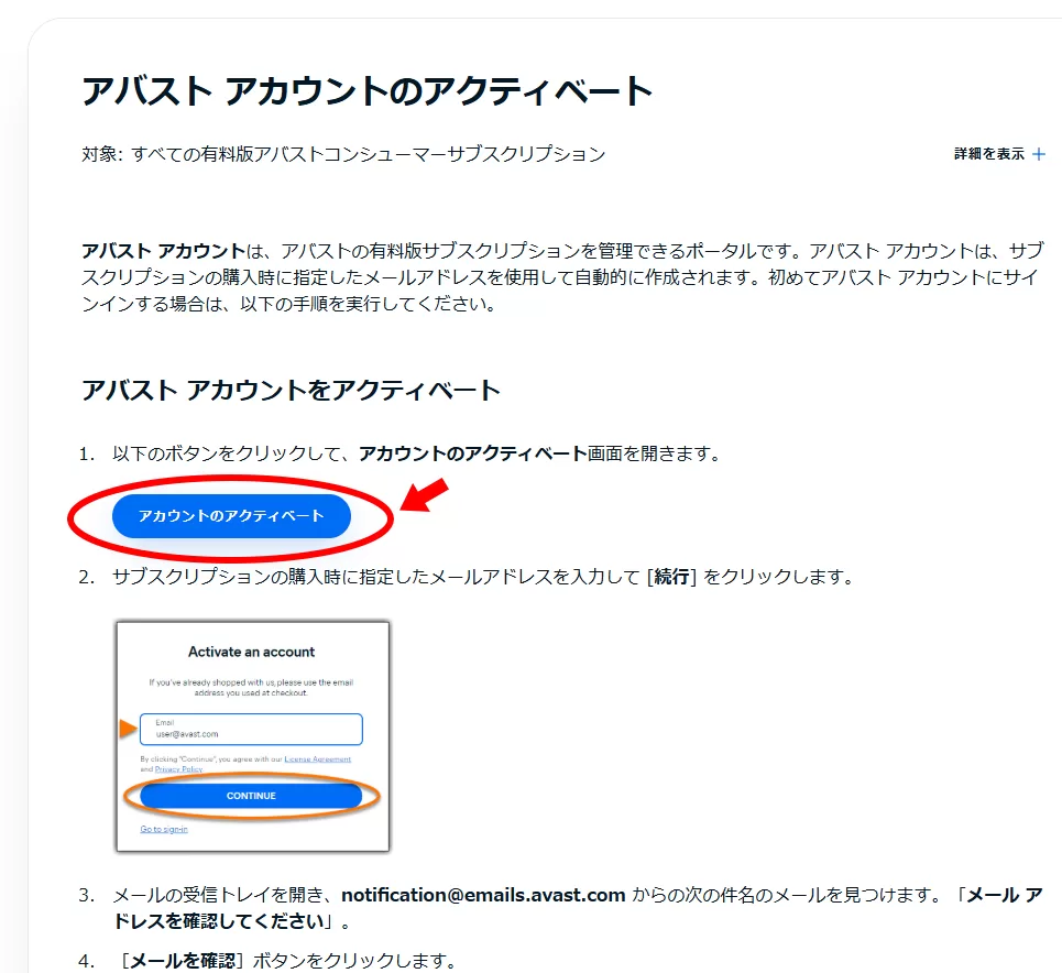 アカウントのアクティベートはサポート内のページ「アバスト アカウントのアクティベート」内のボタンをクリックします↓